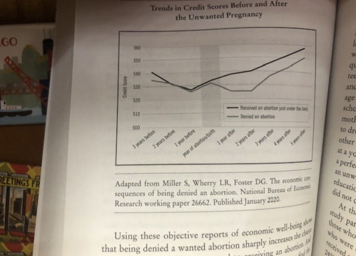 On page 180 of a book containing the Turnaway Study’s findings, a graph shows that after about four years, women who were denied an abortion had an average credit score of 550 compared to 558 for those who had an abortion. The difference between the two groups is not nearly large enough to support the claim that denying women an abortion drastically impacts their socioeconomic status.