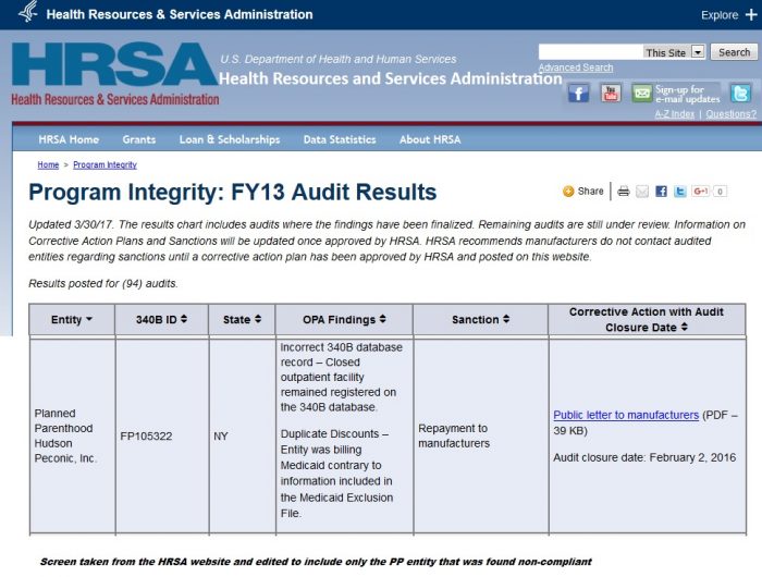 Planned Parenthood Hudson Peconic non-compliant HRSA 340B Program