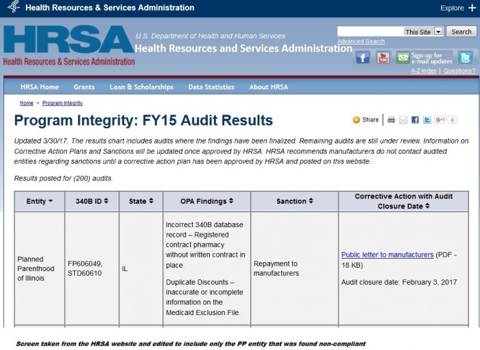 A 2015 HRSA audit found Planned Parenthood of Illinois (PPIL) non-compliant regarding the 340B Drug Pricing Program for the following: