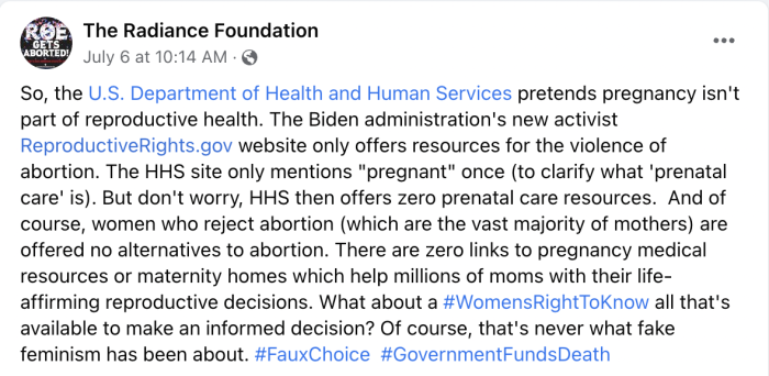 “The HHS site only mentions ‘pregnant’ once (to clarify what ‘prenatal care’ is),” The Radiance Foundation wrote on Facebook. “But don’t worry, HHS then offers zero prenatal care resources. And of course, women who reject abortion (which are the vast majority of mothers) are offered no alternatives to abortion. There are zero links to pregnancy medical resources or maternity homes which help millions of moms with their life-affirming reproductive decisions. What about a #WomensRightToKnow all that’s available to make an informed decision? Of course, that’s never what fake feminism has been about.”