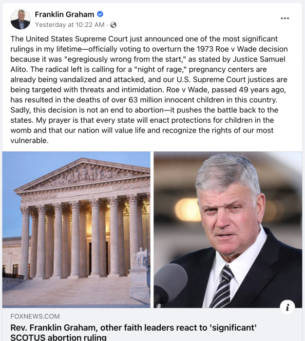 Evangelical leader Franklin Graham announced the end of Roe on his Facebook page. “Roe v Wade, passed 49 years ago, has resulted in the deaths of over 63 million innocent children in this country. Sadly, this decision is not an end to abortion — it pushes the battle back to the states. My prayer is that every state will enact protections for children in the womb and that our nation will value and recognize the rights of our most vulnerable,” he wrote.