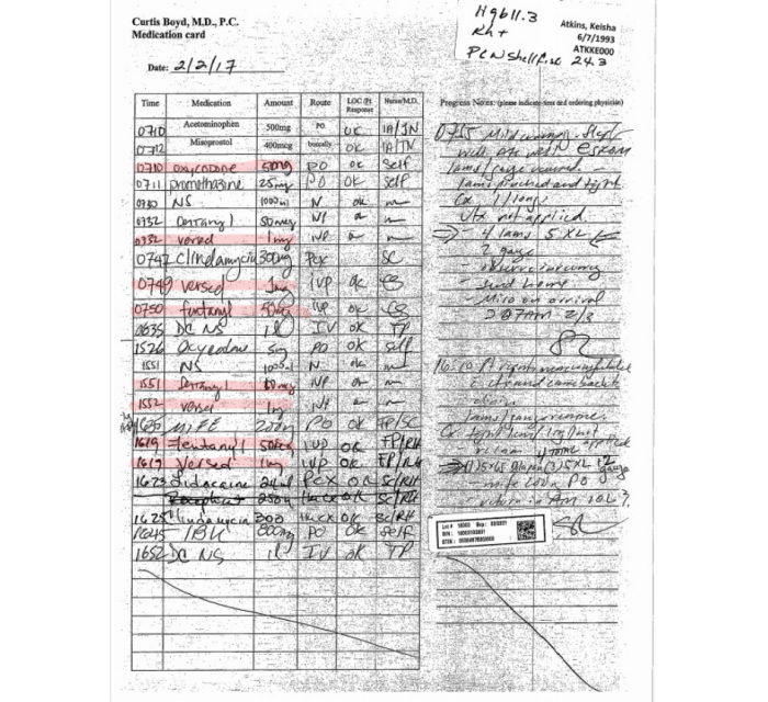 Other documents obtained by Abortion on Trial reveal that in the days between her initial appointment and her death, Atkins was continually given the dangerous medications fentanyl and Versed (midazolam) multiple times each day by abortion facility staff.