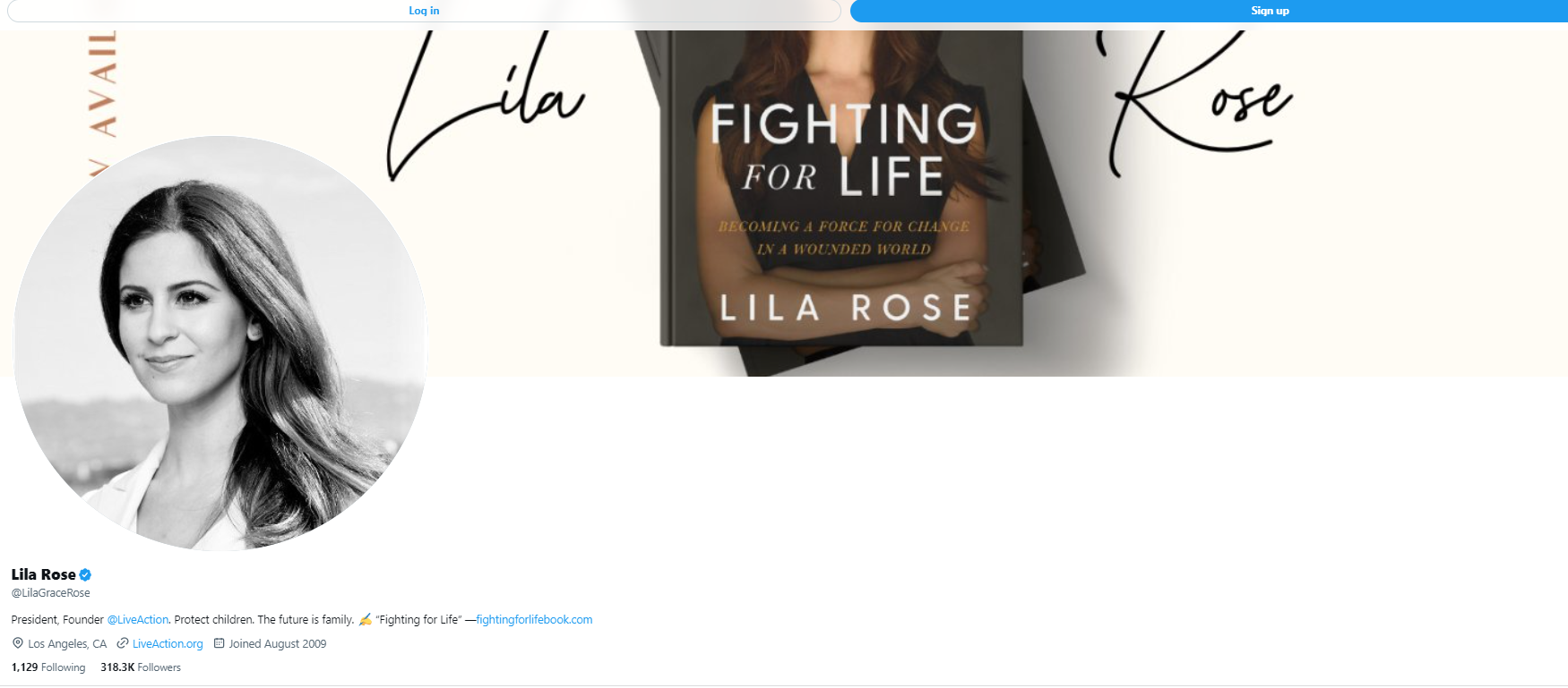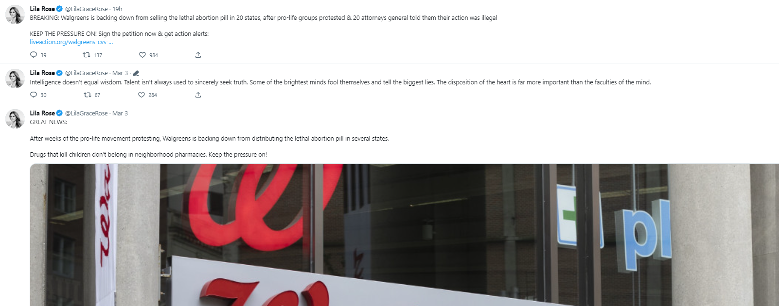 Lila Rose’s tweets immediately prior to the account’s deactivation.