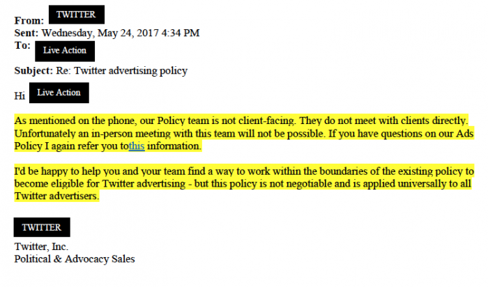 The e-mails were sent following a phone call between Live Action and Twitter, during which Twitter representatives said Live Action is tweeting sensitive material and is not permitted to advertise on the platform. To rectify the issue, Twitter asked Live Action to delete all paid ads and organic tweets it deems “inflammatory,” “abusive,” or “offensive,” and to go through several rounds of edits with Twitter’s policy team until Live Action’s accounts are considered approved for advertising. In addition, Twitter said Live Action’s tweets could not even contain links to its website with “sensitive” content, requiring Live Action to scrub and delete content from its web properties.