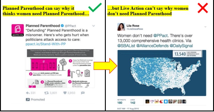 While Planned Parenthood is allowed to advertise on Twitter, the social media company has suppressed Live Action’s ads, calling them offensive and inflammatory. While it won’t censor Live Action’s and Lila Rose’s tweets outright, Twitter has banned the ability to advertise our content until Live Action deletes all tweets it deems offensive – or, in reality, all the tweets that offend Planned Parenthood.