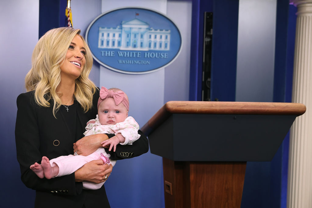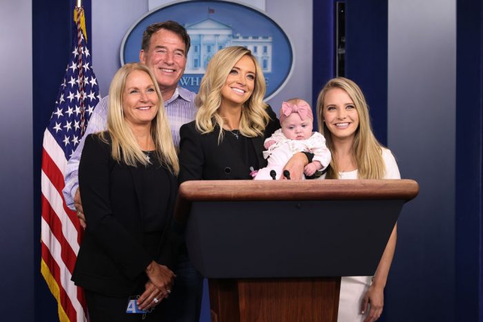 WASHINGTON, DC – MAY 01: White House Press Secretary Kayleigh McEnany holds her five-month-old daughter Blake Gilmartin while posing for photographs with her parents Mike and Leanne McEnany and younger sister Ryann McEnany at the podium in the Brady Press Briefing Room at the White House May 01, 2020 in Washington, DC. Friday was McEnany’s first official news conference since becoming President Donald Trump’s fourth press secretary in just over three years. (Photo by Chip Somodevilla/Getty Images)