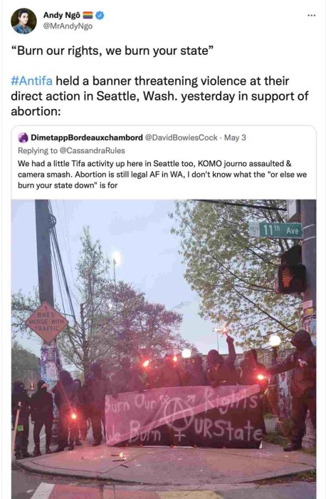 Enraged abortion supporters rioted in cities across the west coast, including Los Angeles, where protestors threw rocks and bottles at police, Portland, and Seattle, where Antifa protestors carried a sign that read, “Burn our rights, we burn ur state.”