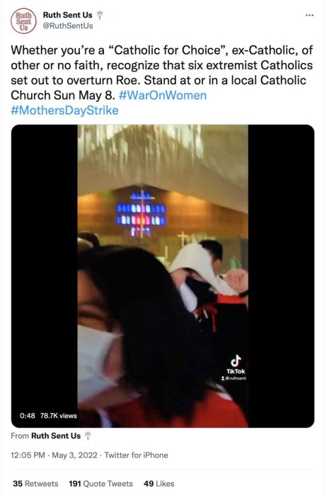 Rioters have broken windows and started fires, spray-painted graffiti, and attacked journalists over the course of the last few days. Pro-abortion protestors have also assaulted pro-lifers outside of the Supreme Court. Businesses were vandalized at a Portland State University protest; one man was arrested for reckless burning and disorderly conduct. Sacred Heart of Mary Catholic church in Boulder, CO, was heavily spray painted with pro-abortion slogans, as this video shows. The pro-abortion group Ruth Sent Us has similarly called for abortion activists to storm Catholic churches during Mass this Sunday, May 8th: