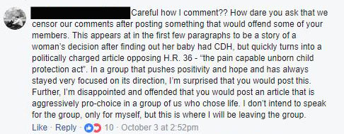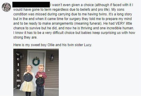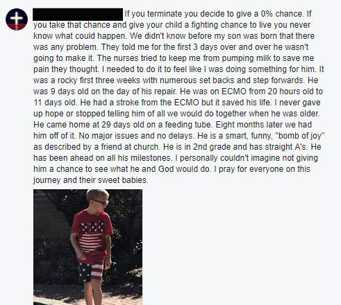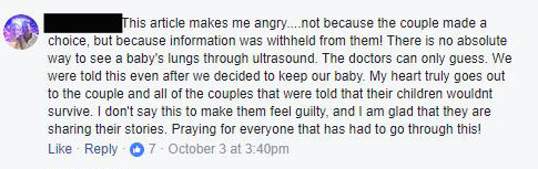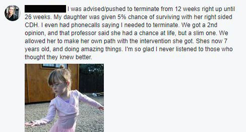 On October 3, 2017, a Facebook group created for parents raising children with Congenital Diaphragmatic Hernia shared an article from the website Motto detailing how a woman aborted her child with the condition. The article was meant to show the injustice of a ban on abortion after 20 weeks gestation; however, mother after mother commented on the Facebook post with stories of how they chose life and how their children are now thriving.